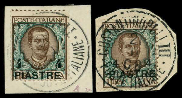 1908, 1l brown & green Victor Emmanuel III with 4pi surcharged 4th and 5th printings (Scott 20B,20E), singles, Fine to Very Fine. Scott $160. (Image)