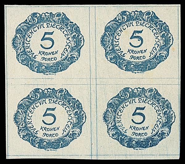 Postage Due, 1920, 5h to 10k complete (Scott J1-J12), set of 12, blocks of four, P.O. fresh, NH, Very Fine and scarce multiples (Scott value for hinged, Michel for NH). Michel 1-12; €1,600 ($1,730). Scott $1,040. (Image)