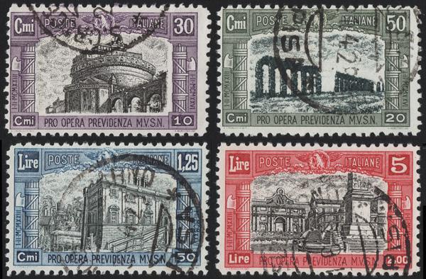 1928, Militia, 30c to 5L complete (Scott B30-B33), all with Pisa c.d.s.s in April or June, 1928, Fine to Very Fine. Sassone 220-223; €1,150 ($1,240). Scott $720. (Image)