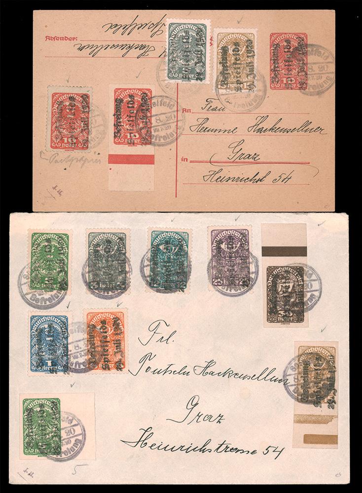 AUSTRIA, SPIELFELD LOCAL ISSUE, 1920 13 VALUES WITH OVERPRINT, tied by Committee d.s. on cover and overprinted 10h postal card, fine-very fine, scarce (Image)