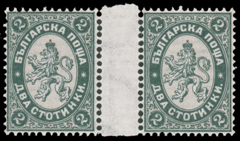BULGARIA, 1885, 2s SLATE GREEN & PALE GRAY GUTTER PAIR NH, #24, fresh, fine-very fine, cat. $56.00 as hinged singles (Image)