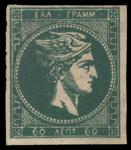 GREECE, 1876, 60L DEEP GREEN BLUE, ATHENS PRINTING, MINT, #52, full margins, o.g., small h.r., tiny thin spot, fine-very fine, signed Scheller, cat. $625.00 (Image)