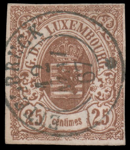 LUXEMBOURG, 1859, 25c BROWN IMPERF USED, #9, full margins, neat town d.s., tiny thin, fine-very fine, signed Scheller, cat. $275.00 (Image)