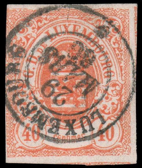 LUXEMBOURG, 1859, 40c ORAMGE IMPERF USED, #12, full margins, just in at left, neat d.s., fine-very fine, signed Scheller, cat. $240.00 (Image)