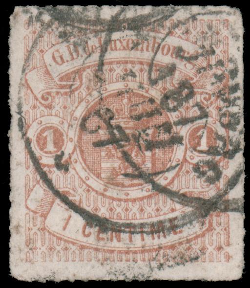 LUXEMBOURG, 1865, 1c RED BROWN ROULETTED USED, #13, fine-very fine, signed Scheller, cat. $240.00 (Image)