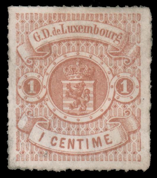 LUXEMBOURG, 1865, 1c RED BROWN ROULETTED UNUSED, #13, well-centered, very fine, signed Scheller, cat. $200.00 as without gum (Image)