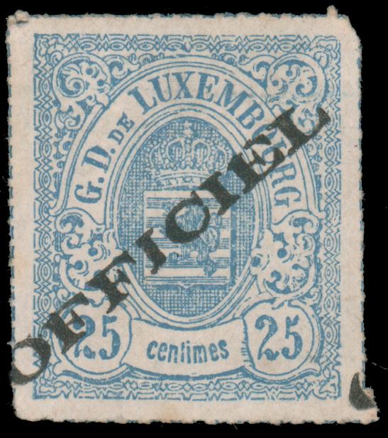 LUXEMBOURG, 1875, 25c BLUE OFFICIAL UNUSED, #O6, without gum, very fine, signed Scheller, cat. $140.00 (Image)