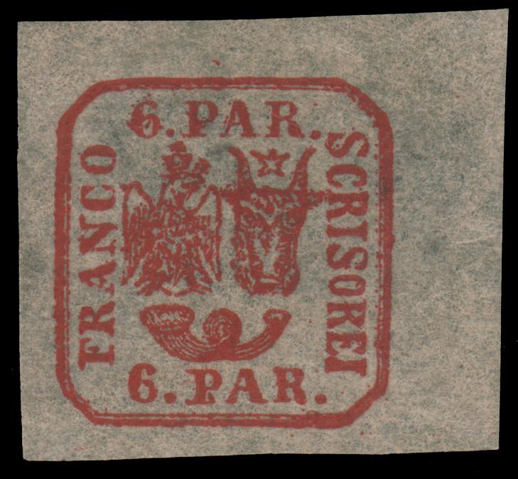 ROMANIA, 1862, 6p CARMINE MINT, #15, huge margins with selvage at right, previously hinged, very fine, cat. $95.00 (Image)