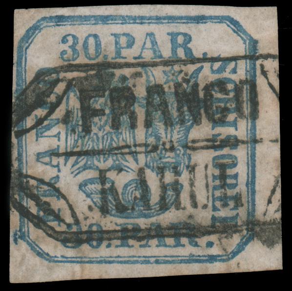 ROMANIA, 1862, 30pa BLUE USED, #18, socked-on-the-nose cancel, very fine, signed Scheller, cat. $65.00 (Image)