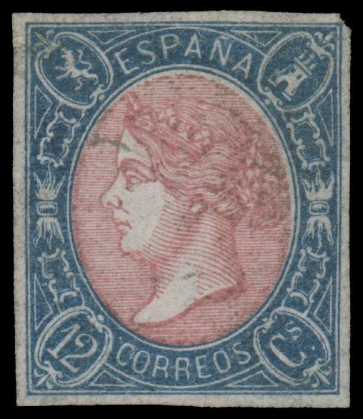 SPAIN, 1865, 12c BLUE & ROSE UNUSED, #69, full margins, regummed, still fresh and fine-very fine, cat. $425.00 (Image)