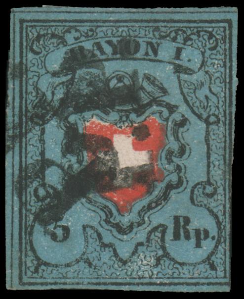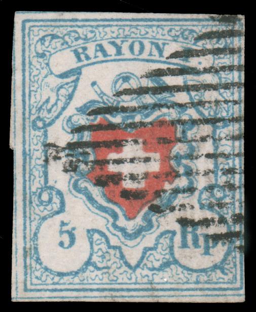 SWITZERLAND, 1850, 5r LIGHT BLUE, BLACK & RED USED, #7, full margins to just in at bottom right, "P.P." h.s., fine, signed Scheller, cat. $575.00 (Image)