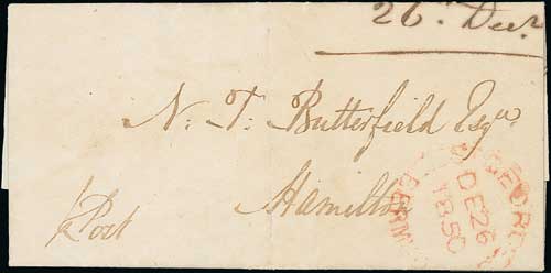 1850 (Dec 26) Small entire letter, folded to just 96x48mm, from St. Georges to Hamilton "p. post" with red "ST GEORGES / BERMUDA" datestamp (PM5) on the front, vertical file fold, a fine and appealing small letter, ex Sir Henry Tucker. Photo on Page 110. (Image1)