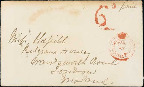 1862 (Dec 26) Stampless cover (with enclosed letter) to England handstamped red "6d" and "PAID / AT / IRELAND ISLE BERMUDA" crowned circle, backstamped "IRELAND-ISLE / BERMUDA" datestamp (PM5 in black) and in London. Fine and scarce, 24 examples recorded by Forand/Freeland (with just one later than this example), fifteen examples of the red "6d" recorded, ex. Ludington. S.G. £7,500. Photo on Page 110. (Image1)