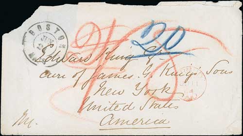 1864 (June 11) Stampless double rate cover to New York prepaid 8d (initially misrated 2/- as if to G.B, the charge deleted and altered to "8"), blue crayon "20" for the double U.S rate, with red "BERMUDA / A / PAID" c.d.s (P4) and Boston Mass c.d.s (June 21). Torn piece from upper left corner, nevertheless very scarce, just thirteen examples of this Paid type P4 datestamp recorded, several of which are very poor strikes. Ex. Ulrich and Dickgiesser. Photo on Page 118. (Image1)