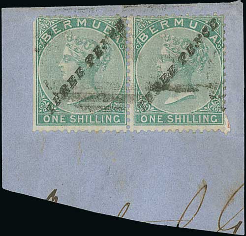 1874 3d on 1/- Green, second type surcharge, horizontal pair used on piece, left stamp with perfs trimmed at left and small fault at upper left corner, the right stamp fine. A scarce pair, the largest recorded multiple. S.G. 13b, £1,600+. Photo on Page 124. (Image1)