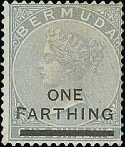 1901 One Farthing surcharge on 1/- bluish grey, variety handstamped "F" in "Farthing", unused no gum, traces of a pressed crease. A rare variety, just ten examples recorded, eight mint or unused (one in the Royal Collection) and two used. A mint example with minor toning sold for £3,000 in our October 2022 auction. With R.P.S Certificate (1982) with the rather harsh observation "soiled & creased". A good example of this rarity. S.G. 30ba, £8,000. Photo on Page 120. (Image1)