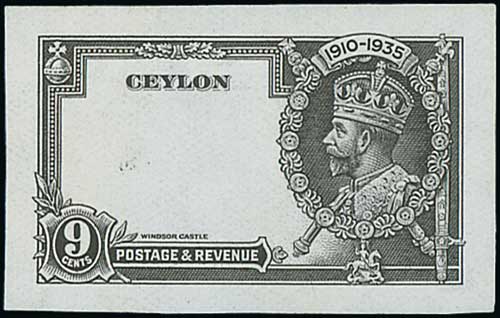 1935 Silver Jubilee, 9c frame die proof in black on white wove paper, 44x28mm. A rare proof, removed from the De La Rue Appendix sheet (requisition 7231). Photo on Page 120. (Image1)