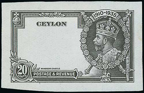 1935 Silver Jubilee, 20c frame die proof in black on white wove paper, 44x28mm. A rare proof, removed from the De La Rue Appendix sheet (requisition 7231). Photo on Page 120. (Image1)