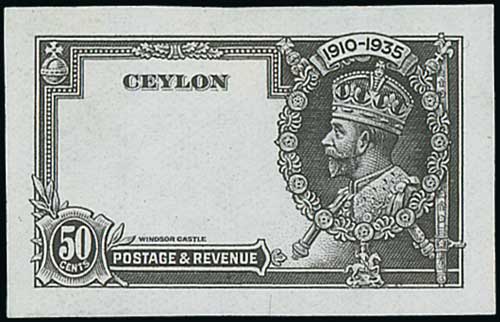 1935 Silver Jubilee, 50c frame die proof in black on white wove paper, 44x28mm. A rare proof, removed from the De La Rue Appendix sheet (requisition 7231). Photo on Page 120. (Image1)