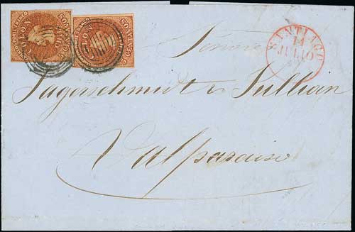 1855 (July 30) Double rate entire letter from Santiago to Valparaiso bearing two examples of the 5c burnt sienna recess printed by H.C Gillet from Perkins Bacon plates (S.G. 10), both with four good margins, tied by barred circle obliterators, a red Santiago c.d.s on the front. Horizontal fold clear of the stamps, otherwise fine and a scarce double franking of this uncommon stamp. S.G. £425 for a single franking on cover. Photo on Page 118. (Image1)