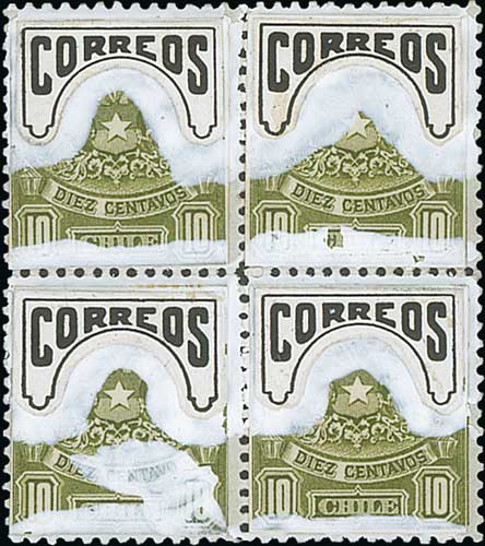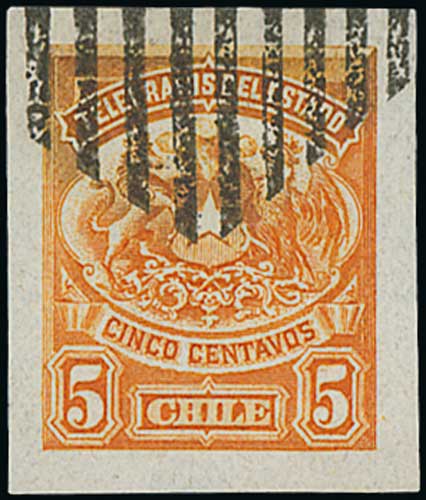 Official/Telegraph Seals. 1885-1915 Seals including Santiago Post Office seals of 1893 and 1894 (5), Valparaiso Post Office seals of 1885 (4), 1889 (5), 1895 (3), 1897 (4) and 1924 (2) and other Post Office seals of 1900 (3), 1906 (2) and 1915 (15, round cog-wheel type with differing Post Office names); and telegraph seals (17, with a mint block of twelve); also 1891 Tierra Del Fuego 10c locals (8), an interesting and scarce group written up on seven pages. (69).