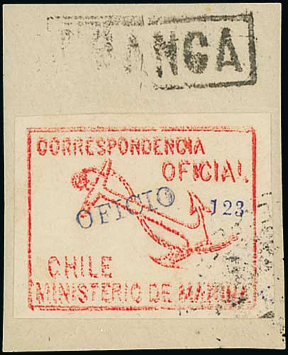 Officials - Ministry of Marine. 1906-07 Mint and used selection on six pages with inland use single frame line set of four used, genuine stamps (and not the later reproductions), the red stamp on piece with boxed "FRANCA" handstamp alongside (illustrated in an article in "Chile Philatelico", just 200 of each stamp issued), double frame line (14, thirteen used including all four colours, just 100 of the green stamp issued, 1,000-3,000 of the other values issued), reprints without control numbers (3); external use stamps with "MARINA / OFICIAL" handstamped overprint and oval Ministry handstamp on reverse (3, also a forgery), "OFICIAL" over Anchor overprints with 1c half overprint printed by the Ministry from the defaced die with explanation by Victor Vargas, issued stamps mint (6) and used (3), and forgeries (25). An interesting study with some rare stamps. (60). Photo on Page 212. (Image1)