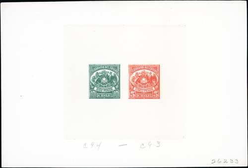 Telegraph Stamps. 1883 Large size telegraph stamp issue, authorised for postal use in 1891 during the civil war, the superb collection with large size die proofs of the 2c, 10c, 20c and 1p in adopted colours (151x224mm, 20p with American Bank Note Co. imprint) and 10c green + 5p red die proofs in issued colours struck together on one single proof piece (224x151mm), imperf 10c and 1p proof pairs, specimen set of five, mint stamps with 1p blocks of fifty, telegraphically used stamps, postally used stamps with 1891 cancels (54), uses on 1891 covers (20), also an 1896 cover, a fine lot. (c.250). Photo on Page 142. (Image1)