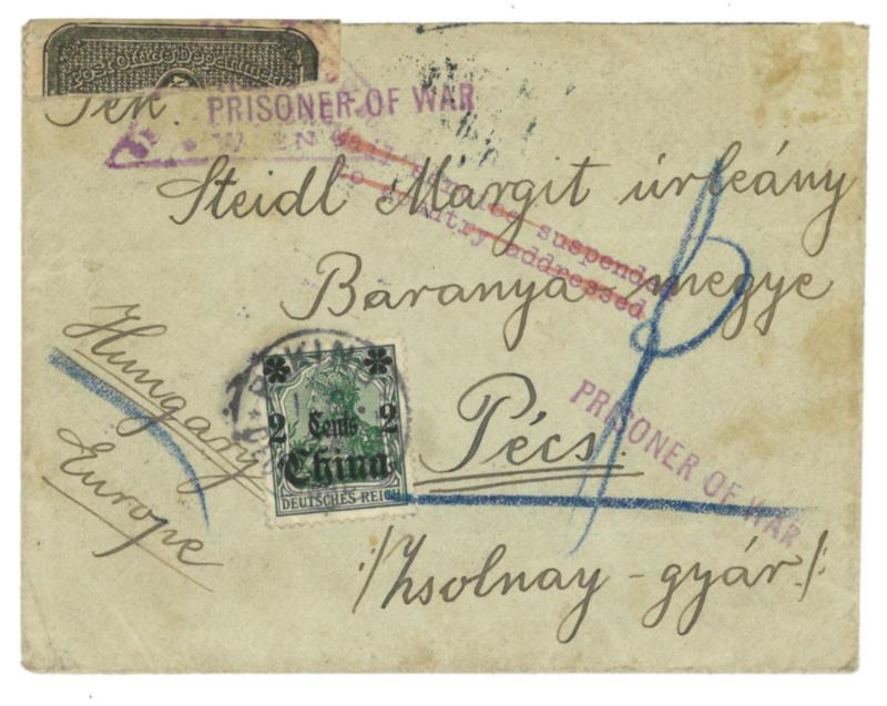 1917 member of KuK Marinedetachement, Peking (1 Feb) to Hungary. WWI POW cover, f.w. Germania ovpt. China 2c + 4c in pair on both sides, tied by Peking German PO cds. Showing "PRISONER OF WAR" cachet on front.