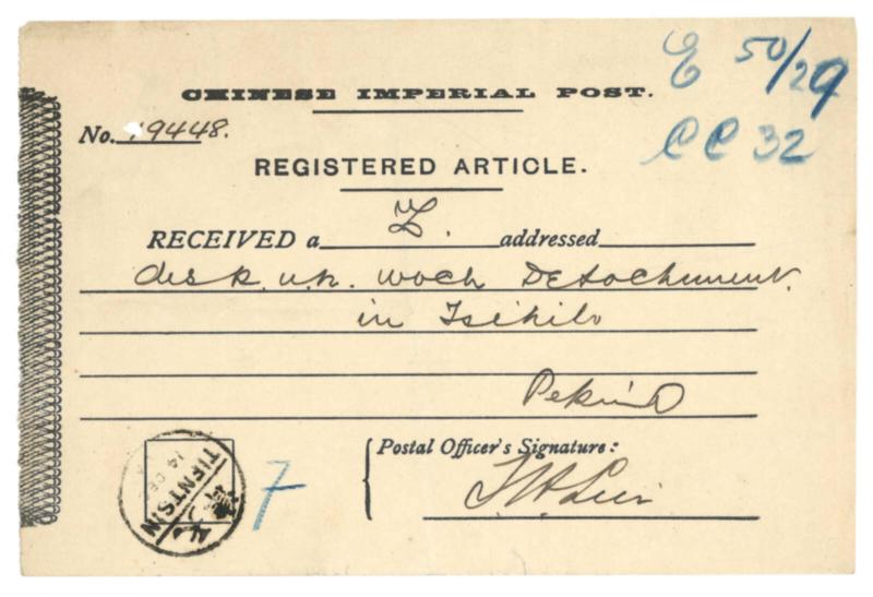 1903 (14 Dec) Chinese Imperial Post registration receipt of a mail addressing to the KuK Wachdetachment in Tsihilo, Peking, applied with Tientsin bisected bilingual cds.