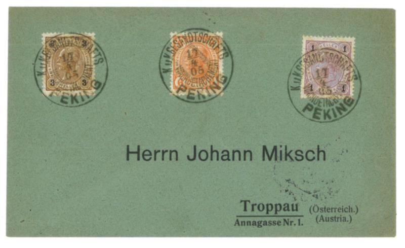 1905 Peking (17 Apr) to Austria , f.w. Emperor Franz Josef I 1h + 3h +6h, tied by "KuK Gesandtschafts / Wachdetachement / Peking" cds. Arrived Troppau (2 Jun). Dr. Bruce J Lwein.