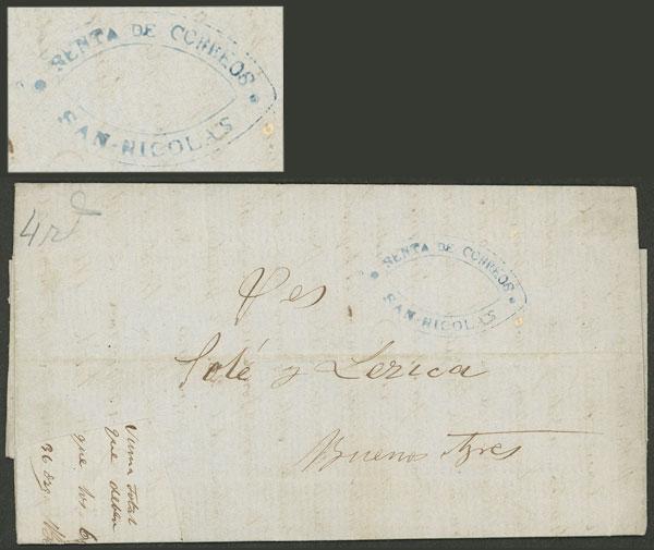 SIN3, entire letter sent from San Nicolás to Buenos Aires, dated 24/SE/1859, with the mark "RENTA DE CORREOS - SAN NICOLÁS" in blue double ogive perfectly applied, rating of 4 Rs, the text is about a shipment of goods, with small defects (Image)