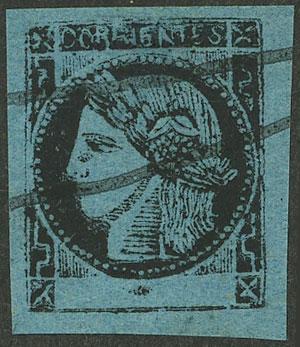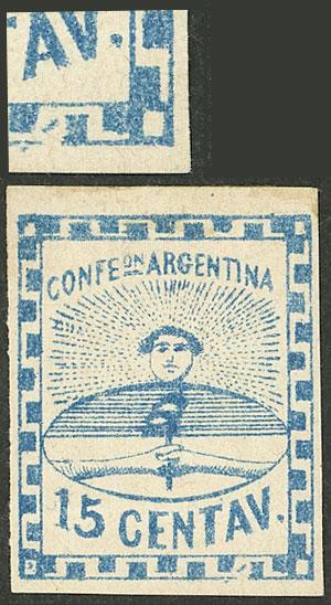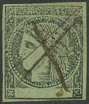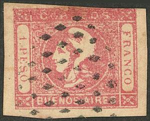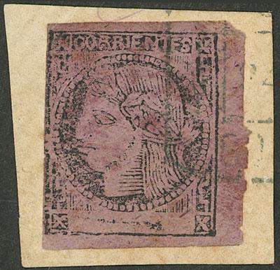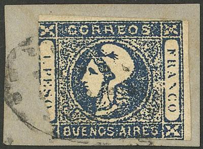 GJ.17A, 1P. indigo (very rare color!), with dotted 6x6 cancel of San Nicolás, on fragment, corner defect, catalog value US$140 (Image)