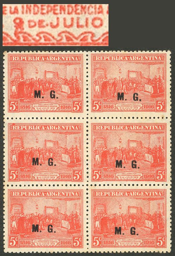 GJ.141, block of 6, one with VARIETY: "9 in 9 de Julio retouched", excellent! (Image)