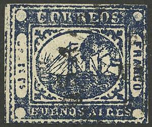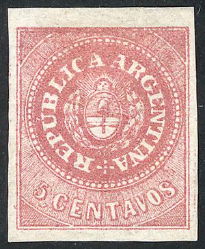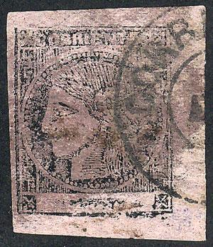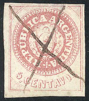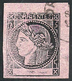 GJ.16, dull rose, interesting translucent oily impression, with double circle datestamp of Corrientes, VF quality! (Image)