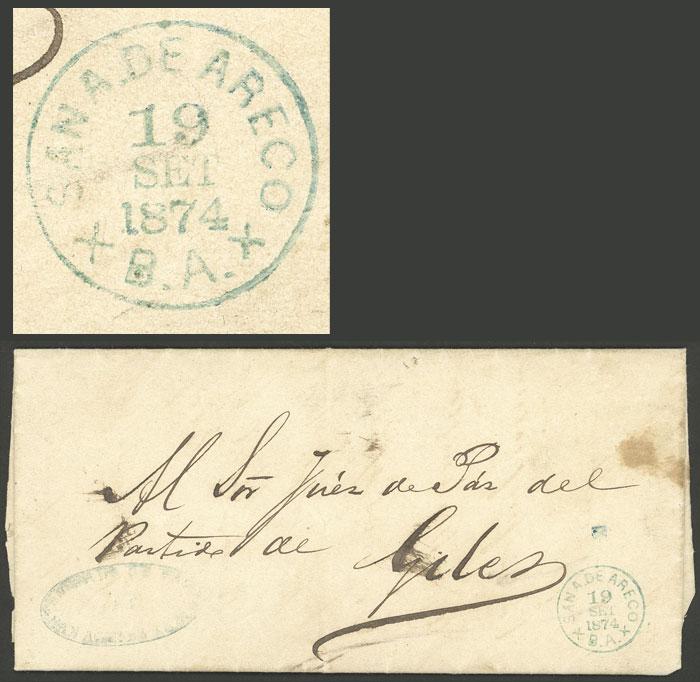 19/SE/1874 San Antonio de Areco - Giles, entire letter with blue mark "SAN A. DE ARECO - XB.A.X" perfectly applied, very fine quality, rare, with Alberto Solari certificate. (Image)