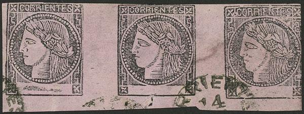 GJ.11, lilac-rose, strip of 3 (types 2-3-4), with Corrientes datestamp. The middle example with small defect, the rest of fine quality, good opportunity at LOW START! (Image)