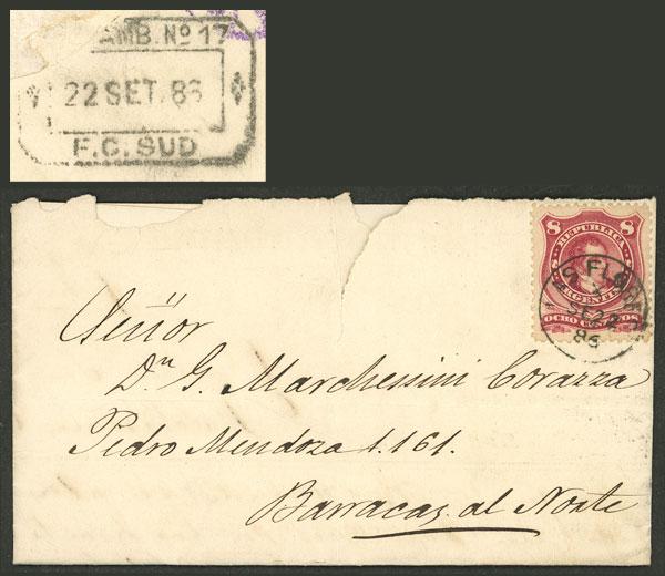 Commercial cover sent from LAS FLORES to Barracas al Norte (Buenos Aires) on 22/SE/1886 franked with 8c., on back there is a rectangular datestamp of "EST. AMB. Nº 17 - F. C. SUD" for the same date, VF! (Image)