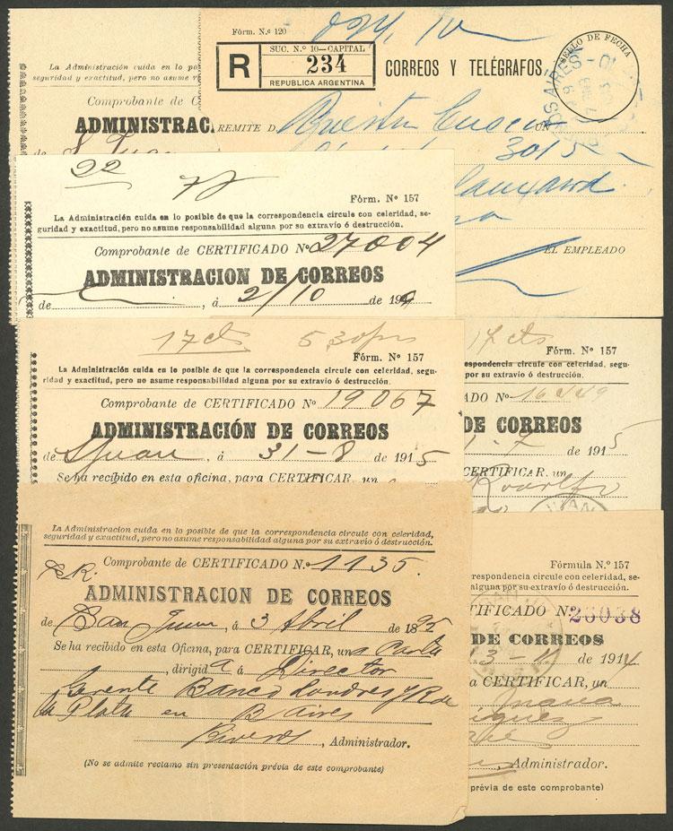 7 Receipts of registered letters dispatched between 1895 and 1915, all different, very fine general quality! (Image)
