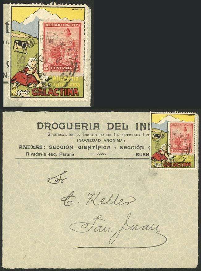 GREAT RARITY: Front of a commercial cover sent from Buenos Aires to San Juan in MAY/1909 franked with 5c. (Seated Liberty) mounted over an advertising cinderella of "Galactina food for children" specially prepared to be used as an "advertising collar", excellent quality, only one known! (Image)