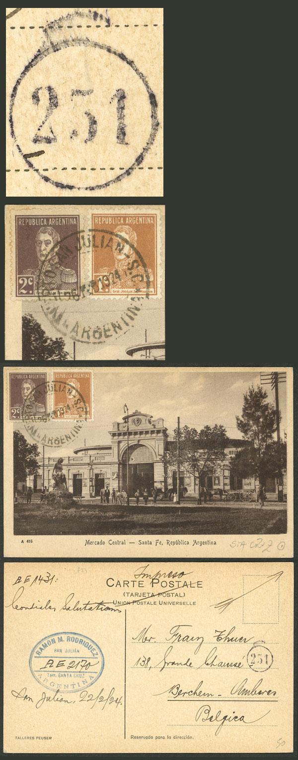 26/FE/1924 Puerto San Julián (Santa Cruz) to Belgium, postcard franked with 3c. (rate for international printed matter) on front, it bears an arrival mark over the address (numeral in small circle), excellent quality, ex-Loeb (its price was US$50) (Image)