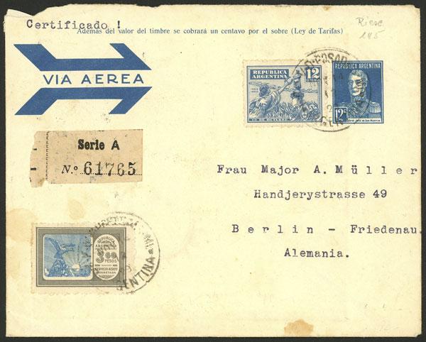 14/NO/1929 Posadas (Misiones) - Germany, airmail stationery envelope of 12c. + additional postage that includes the high value of the first airmail issue (3.60P.), sent to Berlin by registered mail, arrival backstamp for 27/NO, very attractive! (Image)