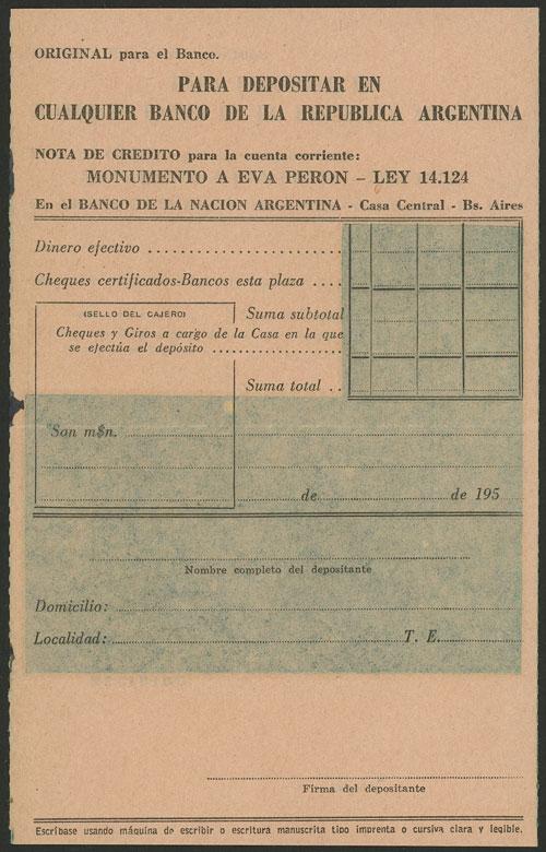 Complete original form (it has 3 parts) "to deposit in any bank of Argentina" for the checking account "MONUMENT TO EVA PERON - LAW 14,124", mint, impeccable, extremely rare and of great historical importance, possibly unique! (Image)