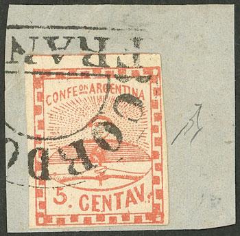GJ.1e, 5c. with variety "double period after CENTAV", on fragment with horseshoe "CORDOBA-FRANCA" cancel, excellent quality, signed by Alberto Solari (Image)