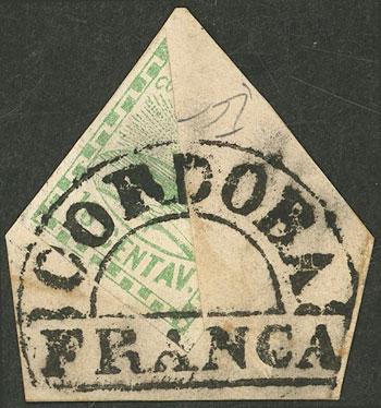 GJ.2BID, 10c. green, diagonal BISECT used as 5c., with complete horseshoe "CORDOBA-FRANCA" cancel, VF quality, signed by Alberto Solari (Image)