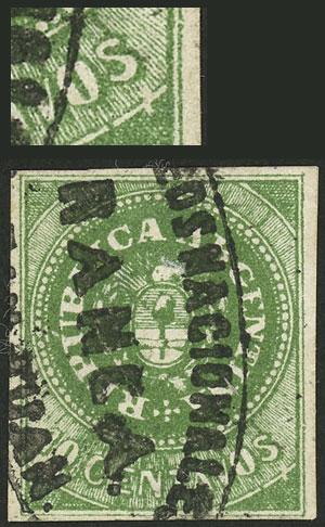 GJ.7b, 5c. WITH accent over the U, with notable wear (last stage of the plate, similar to GJ.14), with the 8 cut angles, pen cancelled, an example of exceptional quality and rariety! (Image)