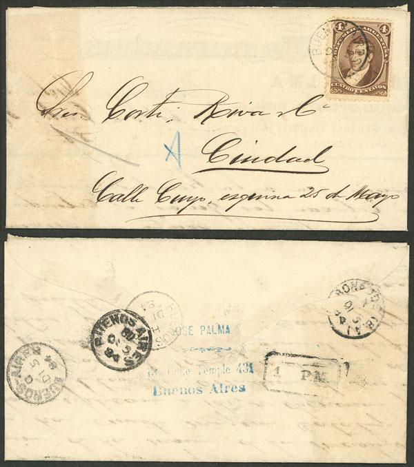 LOCAL RATE OF 4c.: Memorandum used in Buenos Aires on 5/DE/1884 with the correct rate of 4c. (GJ.36), with several transit marks on back, excellent quality! (Image)
