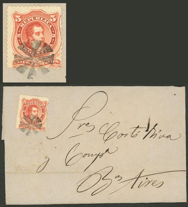 GJ.38, 5c. Rivadavia with groundwork of crossed lines, fraking a folded cover sent from CONCORDIA to Buenos Aires on 8/NO/1869, with mute "circle of 8 wedges" perfectly applied, VF and rare! (Image)