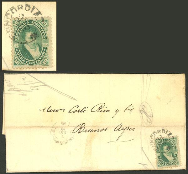 GJ.39, 10c. Belgrano franking a folded cover sent from CONCORDIA to Buenos Aires on 29/NO/1875, it also bears another cancel of Concordia for 1/DE, and on back arrival mark of Buenos Aires 3/DE, very fine quality, interesting! (Image)