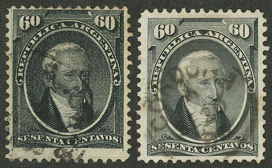GREAT RARITY: GJ.43a, 1867 60c. Posadas with complete DOUBLE IMPRESSION variety, used, excellent quality. This variety is extremely rare, only about 3 or 4 examples are known, its catalog value is wrong and it will be corrected in the next edition. Along a normal example for comparison. (Image)