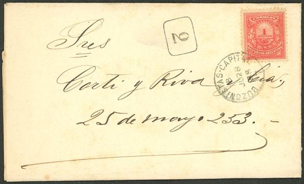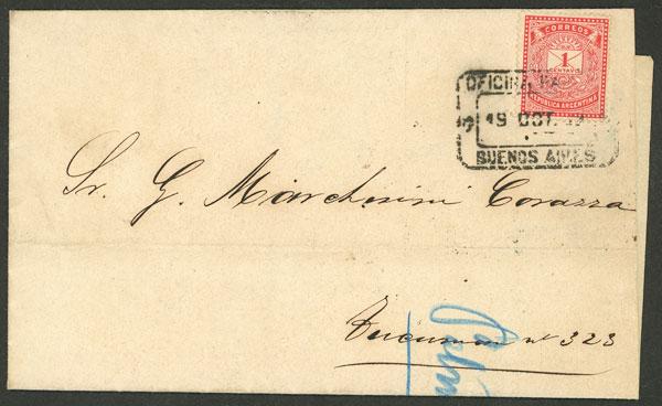 GJ.64, 1882 Little Envelope 1c. rose, perf 14¼, franking ALONE a folded cover that contained printed matter used in Buenos Aires on 19/OC/1882, with rectangular cancel of "OFICINA PARQUE", excellent quality! (Image)